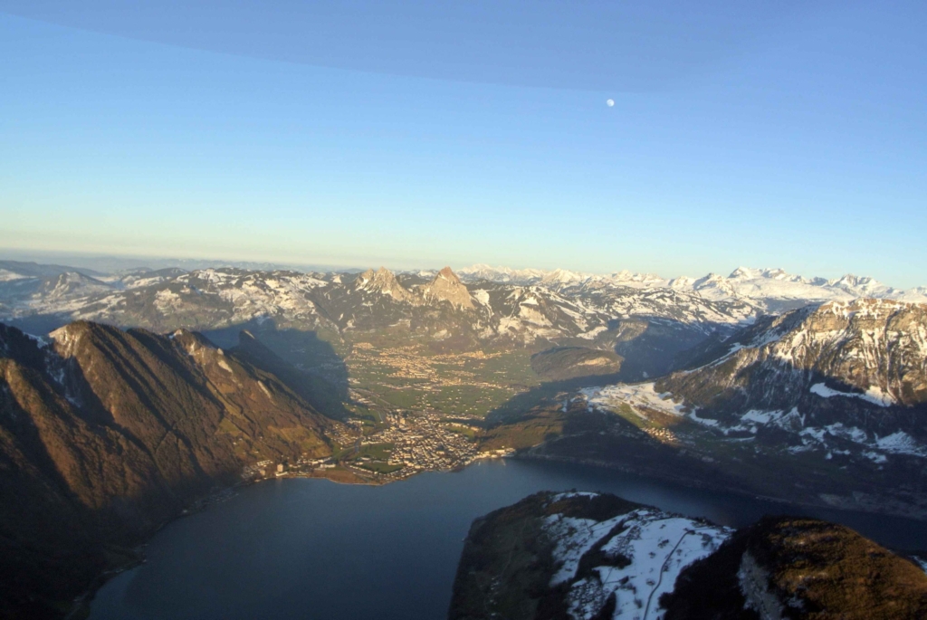 Brunnen, im Hintegrund Schwyz und die beiden Mythen. Die Sonne im Rücken und somit keine Wärme mehr im Cockpit. Gut, dass ich unter 8’000ft bin, jetzt kann ich die Benzinheizung einschalten.